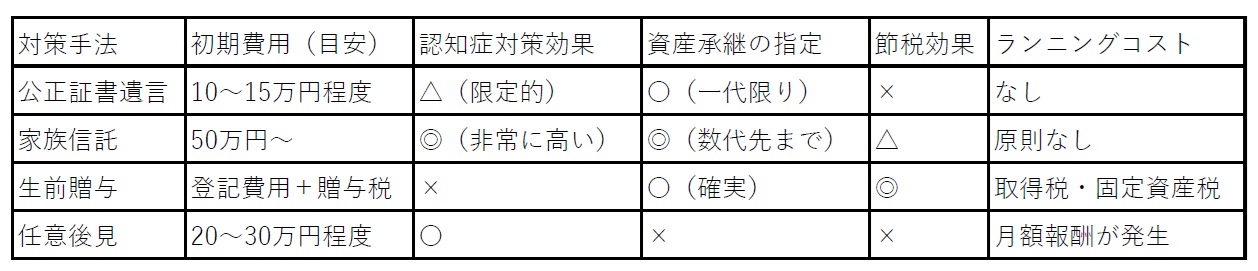 生前対策を選ぶ際、最も重要なのは「認知症対策になるか」と「初期費用」のバランスです。まずは以下の比較表をご覧ください。