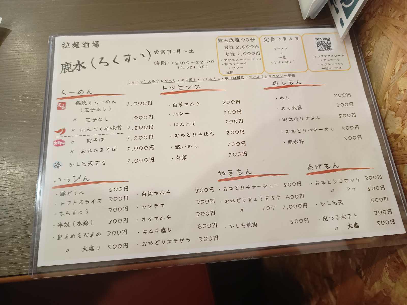 鹿水では鍋焼きラーメンだけでなく、いくつかのサイドメニューや別の麺料理、定食スタイルの提供もあります。