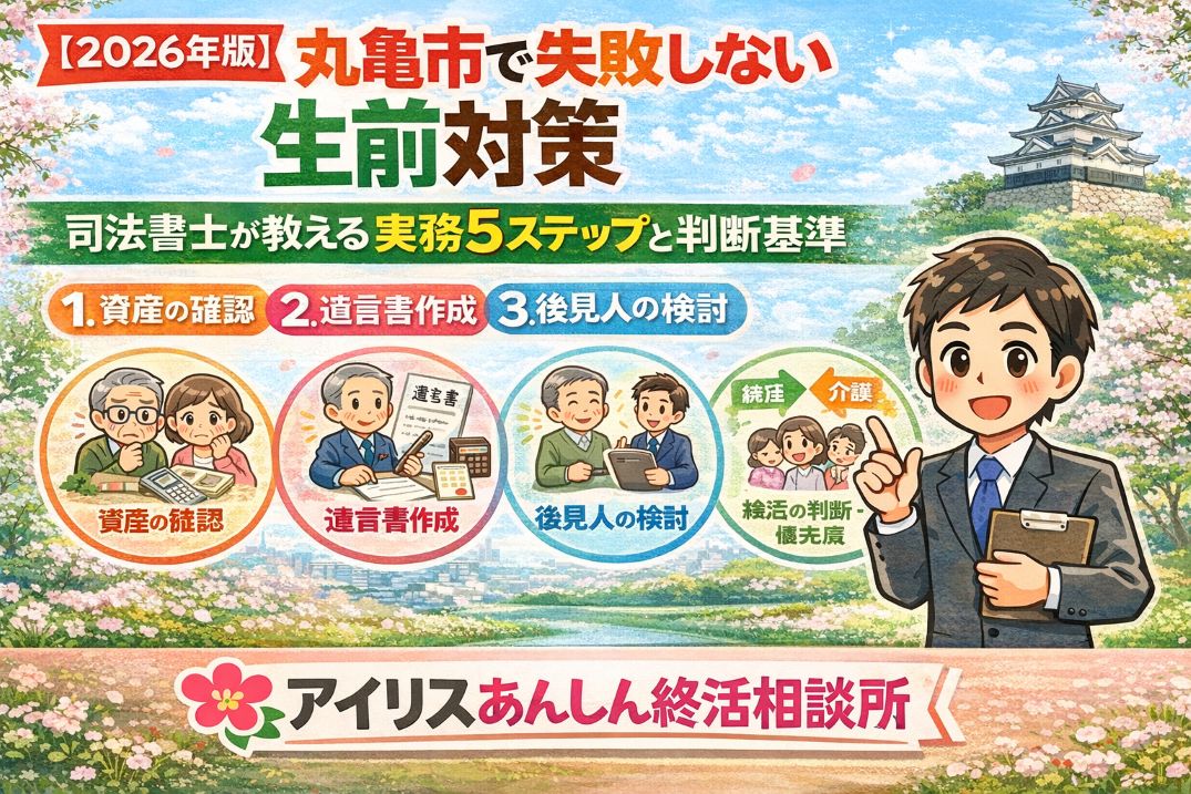 丸亀市で生前対策を成功させるには、①財産の把握、②相続登記を見据えた準備、③遺言書の作成、④認知症への備え、⑤家族との情報共有という5つのステップを、正しい順序で進めることが不可欠です。