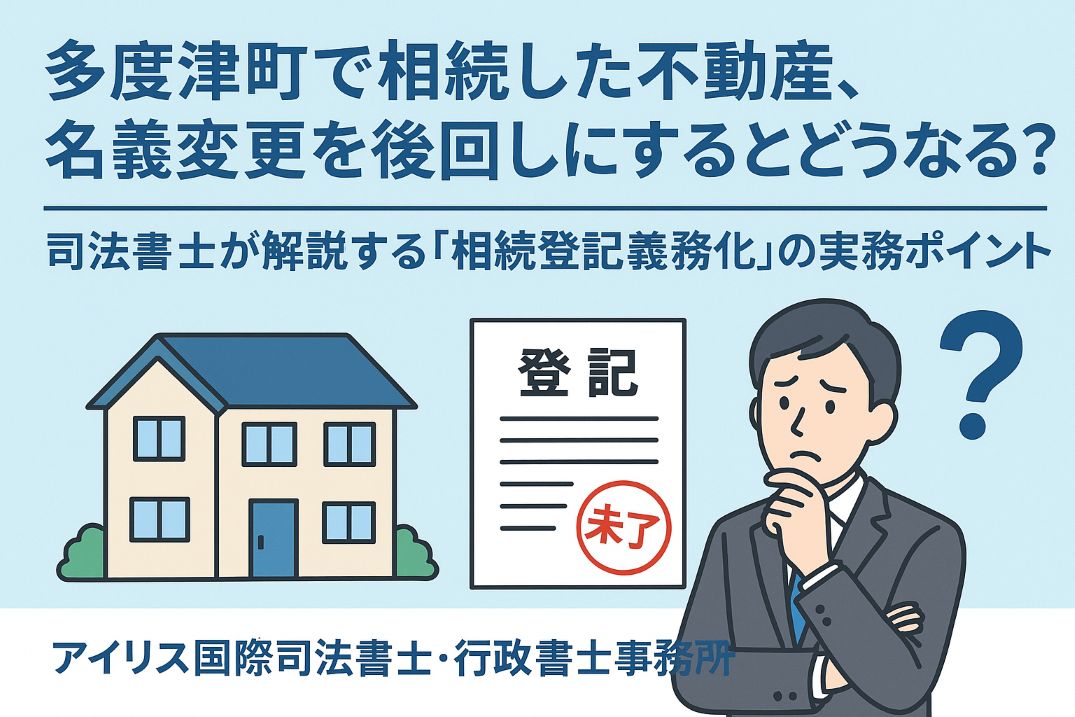 令和6年4月1日から「相続登記の義務化」が全国でスタートしました。相続で不動産を取得した方は、3年以内に名義変更を行わないと過料(罰則)の対象になる場合があります。この記事では、多度津町の地域特性を踏まえ、司法書士が実務のポイントをわかりやすく解説します。